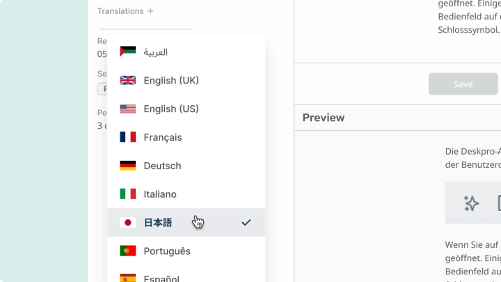 Translate and host multi-language Knowledge Base Articles, News Posts, Guide Pages, and Files for your global client base.