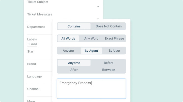 Agents can now refine Ticket List results by filtering against Ticket Subject, Message, and Text in Custom Fields.