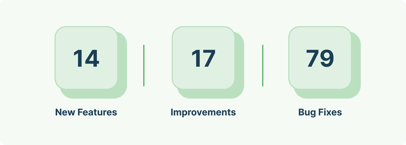 This month's development stats, saw our team making over 100 changes, updates, and fixes across the product functionality.